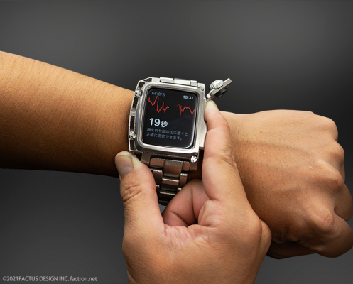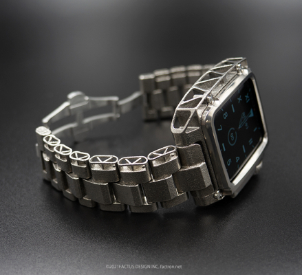 2020年発売の『SUCCESS for AppleWatch5』のiOS心電図APP対応版モデル。金属粉末3Dプリント と 削り出し加工 で製造した、純チタニウム製アップルウォッチジャケット。ウォッチメーカーで多数の腕時計をデザインし、国内外の数々の高級腕時計に深くかかわってきた、FACTRONのデザイナーだからこそできるデザインです。