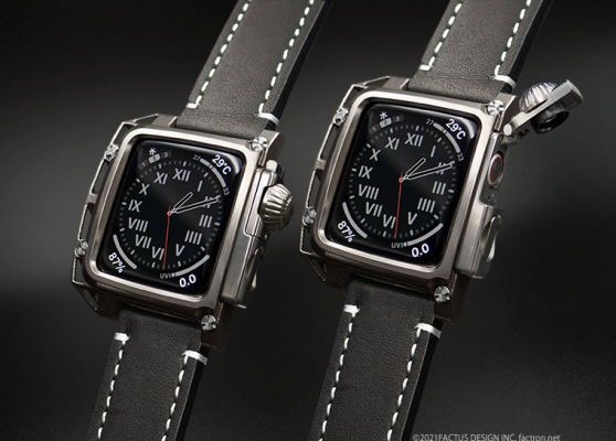 メタルバンドモデルとレザーバンドモデルの2種類。左右で印象が異なるアシンメトリーなデザインです。クラウン側はアンティークウォッチのような大きな菊リュウズタイプのクラウンカバー、左側は建築のトラス構造をモチーフにした、複雑で繊細なデザイン。クラウンカバーは、iOSの心電図APP使用の際に開き、デジタルクラウンに指をあてることができます。ジャケットは、本体は金属粉末3Dプリント、クラウンカバーとフェイス側のべセルは切削加工で製造、オリジナル三つ穴ネジで固定します。メタルバンドは金属粉末3Dプリント製、レザーバンドはしっかりと厚みがあるエイジング処理されたつや消し(マット調)の皮革です。大変重量感があるデザインながら、チタニウム製のため、メタルバンドモデルで約120g、レザーバンドモデルは約59gと非常に軽量です。