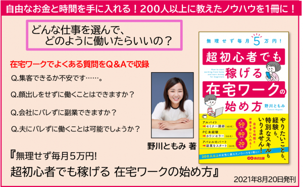 株式会社あさ出版(代表取締役:佐藤和夫、所在地:東京都豊島区)は、野川ともみ 著『無理せず毎月5万円! 超初心者でも稼げる 在宅ワークの始め方』を2021年8月20日(金)に刊行いたします。