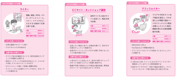 また、16のおすすめの職種を詳しく解説。仕事内容のほか、「スキル(=強み)を身につける方法」「仕事や収入を得る方法」「働き方」の具体例についてもご紹介しています。