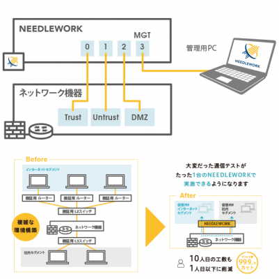 『NEEDLEWORK』は、ネットワーク構築後に実施する各種テスト(※)を自動で実施可能な小型のアプライアンスです。全てのテストを本製品が自動処理するため、人的ミスを限りなく「ゼロ」にするとともに、エンジニアにとって大きな負担となっていたテスト工数を大幅に削減します。ルータ、スイッチ等の検証用機材が不要でNEEDLEWORKがあればテスト可能なため、検証環境を構築する時間も不要になります。