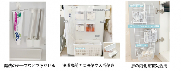 例えば、洗面台は毎朝の掃除をスムーズに行うために何も置かずにすべて浮かせています。また、下着やタオルを入れる棚、洗濯機周りも整えていき、家族全員が使いやすい場所になりました。狭くても収納でいくらでも使いやすい場所、大好きな空間に変えることができるのです。