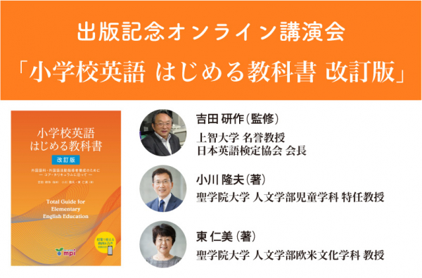 英語教育42年の株式会社mpi松香フォニックス(創立:1979年、代表者:竹村千栄子、以下mpi)は「小学校英語 はじめる教科書 改訂版 外国語科・外国語活動指導者養成のために -コア・カリキュラムに沿って-」の出版を記念して2021年9月25日(土)に監修の吉田研作先生、著者の小川先生、東先生によるオンライン講演会を開催いたします。