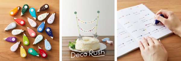 テープを紙の上に引くだけでかわいい絵柄が転写される「デコラッシュ」シリーズ。2011年の発売から小中学生の女子を中心に幅広い層にご愛用いただき、2015年4月には手帳用の実用的な柄を揃えた新シリーズ「プチデコラッシュ」が登場しました。以降、毎日のスケジュールを楽しく記録するデコレーショングッズとして、多彩な柄がご好評を得ています。