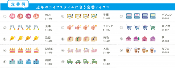 これまで販売してきた手帳用アイコン柄で人気のワンポイント柄を最新デザインにリニューアル。一番人気の「休み」柄をはじめ、「食事」「手帳」「注目」など、人気の定番柄をバリエーション豊かにアップデートしました。