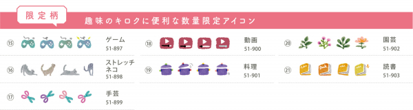 さらに、新「デコラッシュ」発売記念の数量限定デザインとして、「趣味」の記録に便利な「ゲーム」「ストレッチネコ」「手芸」「動画」など7柄をラインアップしています。