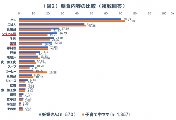 <子育て中ママは、朝食でシリアル類を食べる割合が妊婦さんより低い>