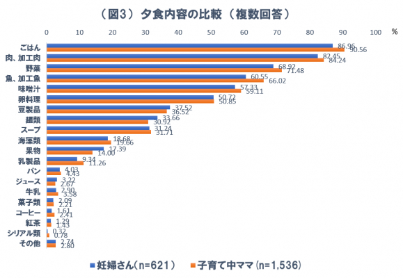 夕食で食べている内容については、妊婦さんも子育て中ママも「ごはん」が最も多く(妊婦さん:86.96%、子育て中ママ:90.56%)、「肉、加工肉」(妊婦さん:82.45%、子育て中ママ:84.24%)、「野菜」(妊婦さん:68.92%、子育て中ママ:71.48%)という順になった。