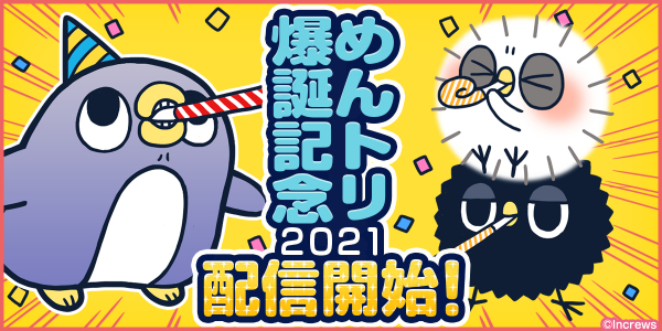 株式会社インクルーズ(東京都渋谷区、代表取締役社長 山? 健司)は、LINE株式会社(東京都新宿区、代表取締役社長 出澤 剛)が運営するコミュニケーションアプリ「LINE」内のスタンプと着せかえショップにて、「ひよこ」と「ぺんぐいん」の「めんトリ爆誕記念2021」LINEスタンプとLINE着せかえを2021年8月26日(木)に一斉に配信致しました。