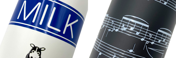 ボトルの表面に、「ロータリーUVインクジェットプリント」で360度ぐるっと1周フルカラープリントができます。アイテム本体のマットな質感に対して、プリントはつやっとした仕上がりになります。ボトルの形を活かしたデザインをしてみたり、メッセージやイラストを入れてくるっと回しながら楽しめるデザインを入れてみても素敵です。