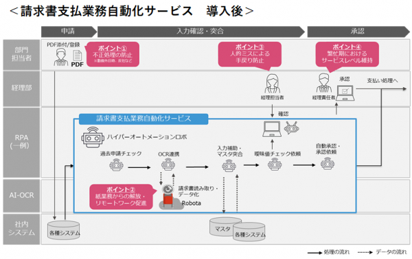 本サービスは、クラウド型請求書管理システムの利用や単独でのRPA、OCR製品の導入などと比較し、必要な既存の業務フローは維持したまま、スピーディかつ広範囲な業務の自動化を実現します。
