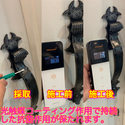 新型コロナウイルスの不活化効果実証実験エビデンス取得済み製品で本試験品を使用することにより、表面についた新型コロナウイルスによる接触感染防止に有効である可能性が考えられたとプレスリリース配信済みである。また従来の光触媒は光を必要とするため、光の当たりにくい場所での抗ウイルス・抗菌効果が1番の課題でした。『ナノディフェンダーAg+( https://nanosolution.jp/nanodefender/ )』は、銀イオンを配合したことで光が当たりにくい場所や夜間でも効果を発揮するよう開発した改良新製品です。殺菌効力分析試験においても、大腸菌・サルモネラ・カンジタ・白癬菌・肺炎桿菌など殺菌率が99.9%と試験結果で出ました。 本試験品を使用することにより、表面についた菌を不活化させることが実証されました。光触媒コーティング施工に関しては養生が不要で、風合いを一切変えずに実施でき、1回の施工で3〜5年にわたり24時間抗ウイルス・抗菌効果を持続します。