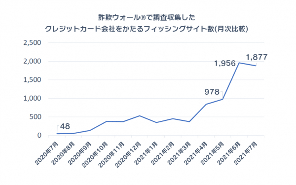 BBソフトサービス株式会社が開発・提供する、ネット詐欺専用セキュリティソフトの詐欺ウォールで調査として収集しているクレジットカード会社をかたるフィッシング詐欺サイト数は、2021年5月の978件から2021年6月は1,956件まで急増、2021年7月は1,877件と前月比79件減少するも、依然として多い傾向が続いています。また、前年同月が48件だったため前年同月比39.1倍に増加していることも分かります。