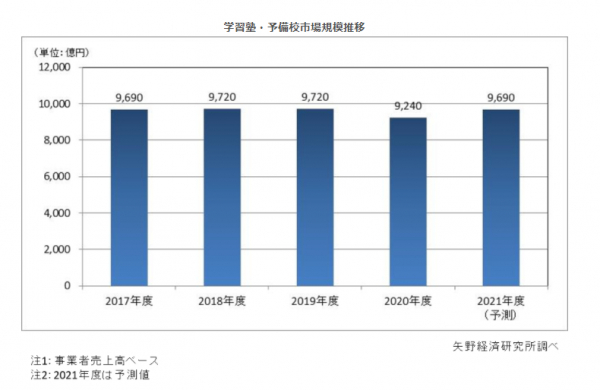 2021年度の学習塾・予備校市場は、感染防止対策の徹底を講じた上で通塾に対する制限が緩和されていることや、学習塾事業者の多くで好調な集客状況がみられていることから、回復に転じるものと予測する。