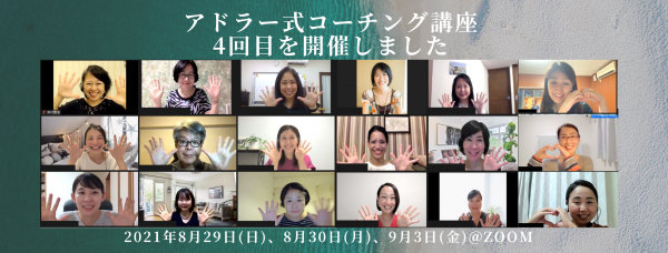 悩みがスッキリ解決!と喜びの声。 アドラー心理学を生活に取り入れた、 第4回目アドラー式コーチング講座 2021年8月29日(日)、8月30日(月)、9月3日(金)開催しました。