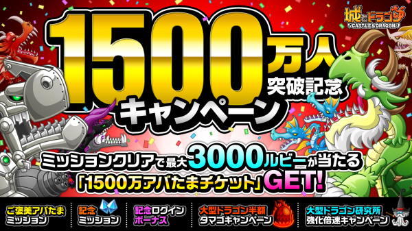 この度、『城とドラゴン』のユーザー登録数が1500万人を突破いたしました。日頃よりお楽しみいただいている皆さまには、心より御礼申し上げます。つきましては感謝の気持ちを込めまして、10日ログインするだけで“1500万アバたまチケット”が1枚もらえる「1500万人ご褒美アバたまミッション」をはじめ、ミッションクリアで最大1300ルビーがもらえる特別な「記念ミッション」や「記念ログインボーナス」、大型ドラゴンのタマゴが半額になって育成効率が大幅UPする「大型ドラゴン研究所強化倍速キャンペーン」などを開催!みなさまのご参加をお待ちしています。