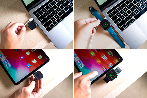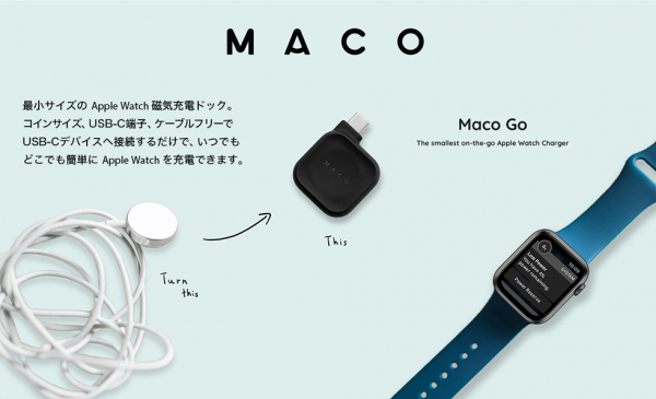 Maco Goは、USB-CポートからいつでもどこでもApple Watchを充電出来るコインサイズの超小型磁気充電ドックです。USB-Cポートを備えたデバイスへ直接接続し、Apple Watchを置くだけで充電がスタートします。MacBook、iPad、スマートフォン(一部の機種を除く)、タブレット、モバイルバッテリー、USB-C電源アダプタなど、USB-Cポート搭載の機器から充電出来ます。
