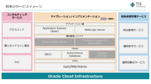 TISのOCI向け導入・移行支援サービスでは、Exadata Cloud Service / Cloud@CustomerやMySQL Database ServiceなどのDBaaS対応範囲の拡大だけでなく、Visual Builder Studioや、Oracle WebLogic ServerをKubernetesなどのコンテナサービスと組み合わせたアプリケーション実行基盤の導入・移行から運用までも支援するサービスを順次リリースしていく予定です。