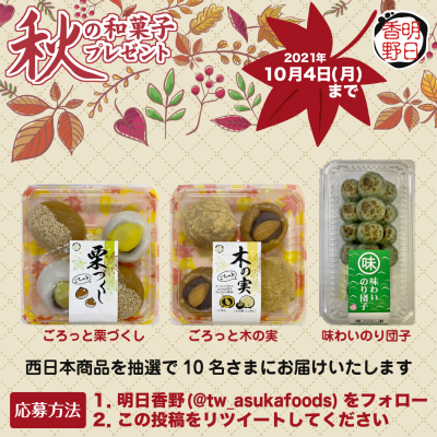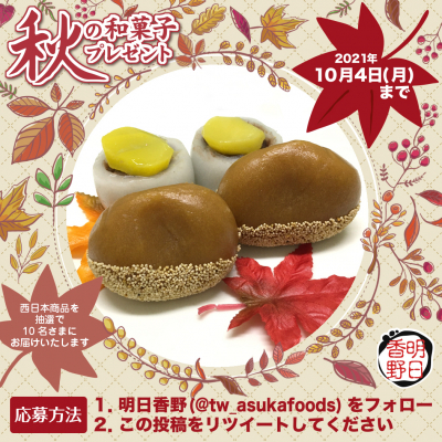 この度、明日香野は2021年9月27日より「秋の和菓子プレゼントキャンペーン」第2弾を開始しました。