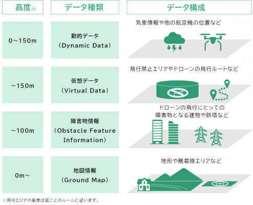 地理空間情報データモデルは、(1)地形や離着陸エリアなどを示す「地図情報」、(2)ドローン飛行において障害物となる建物や鉄塔などの「障害物情報」、(3)飛行禁止エリアやドローンの飛行ルートなどを示す「仮想データ」、(4)気象情報や他の航空機の位置など時間的に変化する「動的データ」の4階層で構成されています。