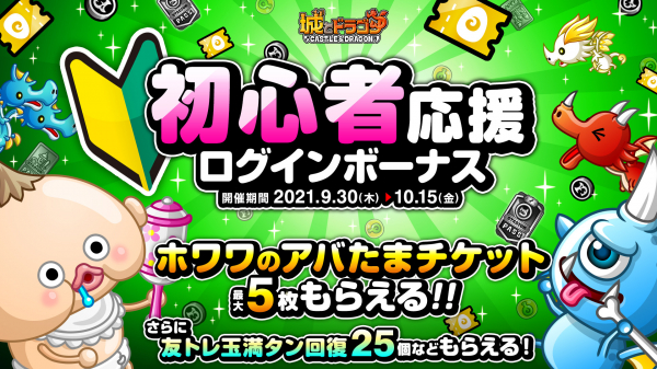株式会社アソビズム(本社:東京都千代田区、代表取締役:大手智之)は、App Store・Google Playにて配信中の『城とドラゴン』で、「初心者応援ログインボーナス」を2021年9月30日(木)より開催します。