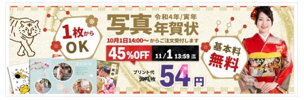 早めの年賀状準備に嬉しい割引の実施。『超早割』の期間中は、通常99円のプリント代が、45%OFFの54円となります。1枚117円で銀塩写真年賀状が作成できるのは、業界最安値クラスです。