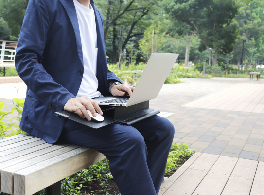 机がなくてもひざ上で使える、マウスパッド付きのPCケースです。最大13.3インチサイズまでのノートPCに対応しています。つまみを引き出せばマウスパッドになり、ひざ上でのマウス操作が可能になります。また、フタを折り返すとPCスタンドとして使用でき、体の負担を軽減します。小物をまとめて持ち運べるメッシュポケットも搭載しています。