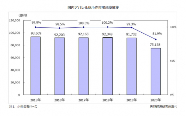 【矢野経済研究所プレスリリース】国内アパレル市場に関する調査を実施(2021年)〜2020年の国内アパレル総小売市場規模は前年比81.9%の7兆5,158億円〜