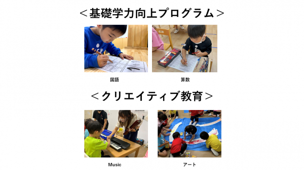 アートではモノづくりの背景や、文化的な背景を学びながら、多様な表現方法を学び、表現の幅を広げることを目指します。様々なものを見て、触って、感じる、時にはアウトプット鑑賞を行うことで豊かな感性を育みます。Musicは音感やリズムトレーニング、声楽、楽器演奏など総合的な音楽教育を通して「聴く力」を育てます。幼少期に聴く力を養うことは、自分の感情や思考を表現する力を成長させることにも繋がります。