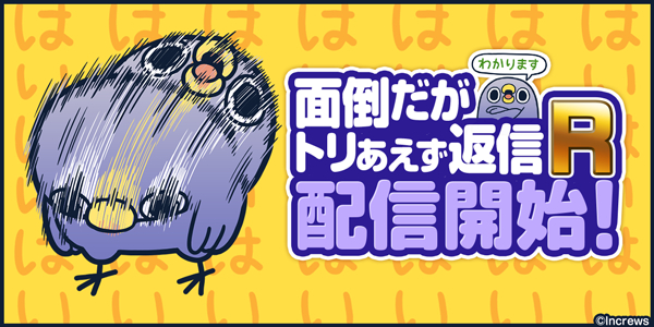 株式会社インクルーズ(東京都渋谷区、代表取締役社長 山? 健司)は、LINE株式会社(東京都新宿区、代表取締役社長 出澤 剛)が運営するコミュニケーションアプリ「LINE」内のスタンプショップにて、「面倒だがトリあえず返信R」を2021年10月14日(木)に配信致しました。