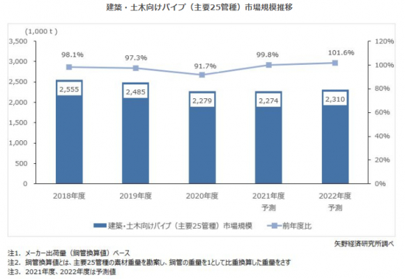 2021年度は建築分野の回復が期待されるが、コロナ禍の影響は続いており、またパイプ需要に波及するタイムラグなどを勘案すると本格回復は2022年度となる見込みである。