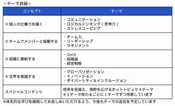 「スクール」はflier内でご利用いただける新機能です。サービス内に新たに「スクール」ページを設け、1テーマ3冊の要約をパッケージとして、16のテーマを用意しました。それぞれのテーマはビジネスパーソンが身につけておきたい4つのコンセプト「(1)個人の仕事力を磨く」「(2)チームでメンバーと協働する」「(3)組織に貢献する」「(4)世界を意識する」に紐づいており、順を追って学ぶことで、徐々に目線が高くなるようになっています。