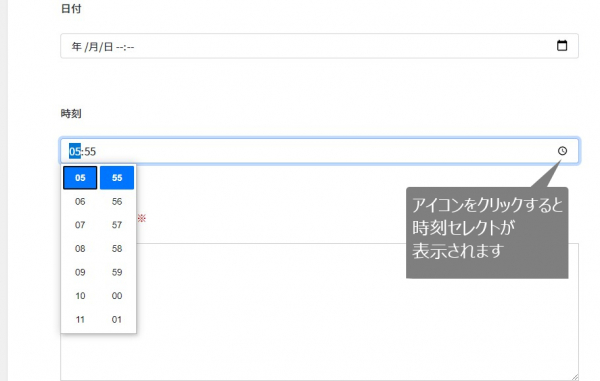 「時刻セレクターから入力機能」は、時刻・時間を記入方式でテキスト入力させるのではなく、00:00のようなスロット形式にして時間と分を選んで入力させる機能です。