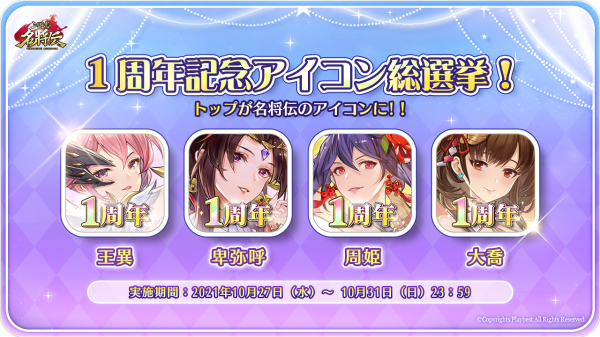 「三国志名将伝」1周年を記念するアイコンをユーザーの皆様に決めていただくTwitterアンケートを実施いたします。投票で1位に選ばれたアイコンは、実際に次回のアップデートにて、アプリアイコンとして実装いたします。