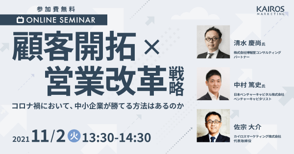 マーケティングオートメーション「Kairos3(カイロススリー)」を提供するカイロスマーケティング株式会社(本社:東京都渋谷区、代表取締役:佐宗 大介、以下「カイロスマーケティング」)は、オンラインセミナー「顧客開拓×営業改革戦略」を2021年11月2日(火)に開催することをお知らせいたします。