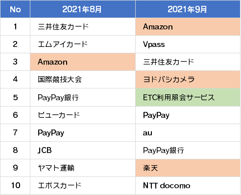 また、詐欺ウォールで収集したフィッシング詐欺サイトで盗用されていたブランドの上位10位は以下の結果となり上位10社中3社をECサイト事業者が占める結果となりました。