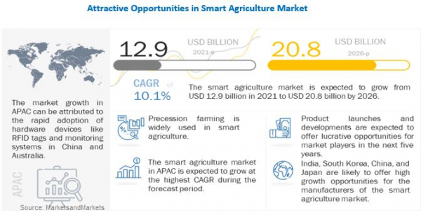 MarketsandMarketsは公開資料において、スマート農業市場は2021年中に129億ドル、2026年までには208億ドルへ成長し、予測期間内のCAGRは10.1%になるとの予測結果を発表しました。スマート農業市場の主な市場成長促進要因はIoTやAIのような先進技術の導入、世界人口の増加などが挙げられます。