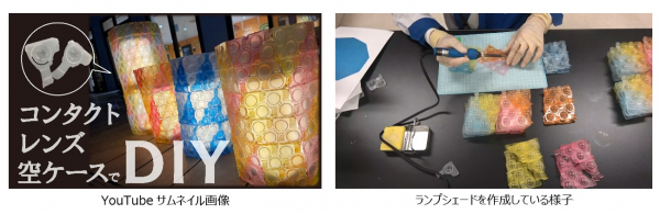 第10回は、「BLUE SEED PROJECT」とのコラボレーション企画とし、使用済みのブリスター(使い捨てコンタクトレンズの空ケース)を使ってランプシェードをつくりました。「BLUE SEED PROJECT」は、プラスチックの再資源化を目的としたプロジェクトです。当社と提携している眼科やコンタクトレンズ販売店等にブリスターの回収ボックスを設置し、自社製品問わず回収しています。収集されたブリスターは有価物として販売し、物流パレットとして再製品化しています。また、ブリスターの販売によって生じた利益は、「美しい海をこどもたちへ」をモットーに海洋ごみ問題解決に向けて活動している一般社団法人 JEAN に全額寄付を行っています。今回はこどもたちにも資源の大切さやこの活動について知って欲しいという想いから、コラボレーション企画とし、リサイクル材を使った工作動画を作成しました。