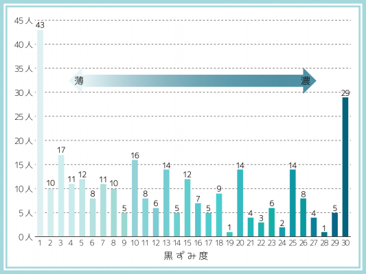 ・2番目に多かった色は一番濃い黒ずみ度30(ダークブラウン)