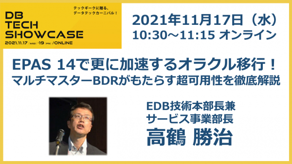 EDBは11月17日から開催される db tech showcase 2021 にて、EPAS 14のリリースで更に加速するオラクル移行とマルチマスターBDRがもたらす超可用性に関する講演を行う。