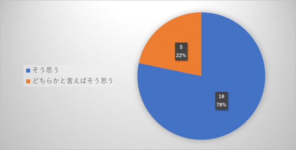 設問2では、「あまりそう思わない」「全くそう思わない」を選択した回答者はおらず、23名全員が「お互いをよく褒める職場やそうした環境で働きたい」と回答をした。