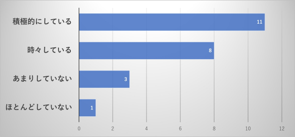 「メールやチャット、口頭など形式を問わず、職場で誰かを褒めたり肯定したりすることはあるか」という設問に対しては、23名中半数近い11名が「積極的にしている」と回答をした。「時々している」と回答をした8名を合わせると、全体の8割以上が「自分から誰かを褒めたり肯定したりする言動や行動をしている」と回答する結果であった。