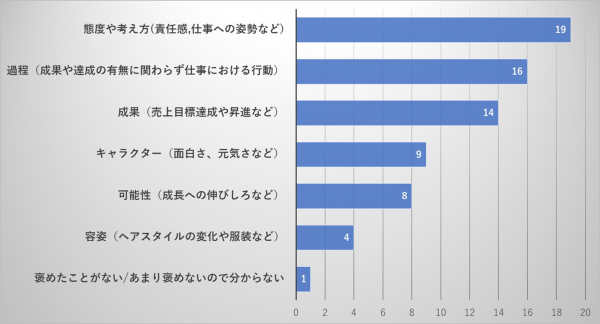 職場内で誰かを褒める際、どのような点について褒めることが多いかに関しては、「態度や考え方」を選択した回答者が最も多く、8割以上にあたる19名が選ぶ結果となった。続いて多かったのは「仕事の過程について」であり、16名が回答。これら2つに対しては、「相手の仕事への取り組み方や頑張りを見ているという安心感を与える」という意図や理由で選択をした回答者が多かった。