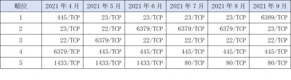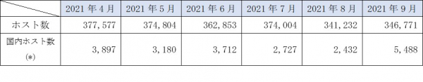 当該期間におけるダークネット宛に通信をしたホスト数については、図2の観測結果となりました。全体的には特に目立ったホスト数の増減が無いもの、9月だけ国内ホストの増加が見受けられるのは、送信元を詐称したパケットによるものです。
