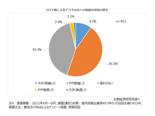 法人を対象としたアンケート調査において、コロナ禍によるデジタル化への取組み状況の変化について尋ね、国内民間企業453件の回答を得た。「大きく前進した」「やや前進した」「変わらない」「やや後退した」「大きく後退した」の中から必ず1つ選択する方式で行った。 本調査ではデジタル化を、デジタル技術によって今まで人間が行っていた業務を効率化したり、新たな付加価値を創出したりする取組み全般と定義している。