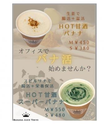 「BANANA JUICE TOKYO」とのコラボレーションにより、生スピルリナ「タベルモ」入りホットメニュー『甘酒スーパーバナナ』を 11 月 29 日より「BANANA JUICE TOKYO」にて発売いたします。「スーパーフードの王様」と呼ばれ、未来のたんぱく資源としても注目されている「スピルリナ」を使用したホットドリンクメニューは日本で初めての試みとなります。