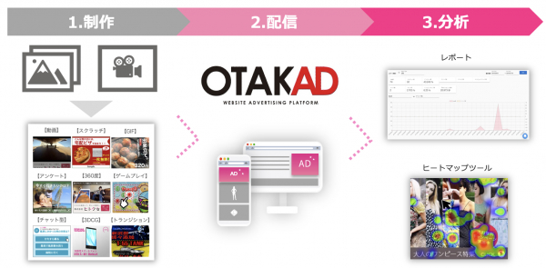 2019年10月にリリース。講談社の各ウェブメディア(NET ViVi、with online、VOCE、mi-mollet、FRaU、現代ビジネス、マネー現代、ゲキサカ、FORZA STYLE、COURRiER JAPON、FRIDAYデジタル)に訪れる読者の記事閲覧データを基に、独自に開発したAIによって閲覧記事の傾向から趣味趣向を指数化し、読者の「オタク」度合いを解析。クライアント様のご要望にマッチした広告配信を実現することで、読者の消費行動と広告訴求を実現でき、広告の配信結果から様々な顧客ニーズや商品価値を可視化できる広告配信プラットフォームです。
