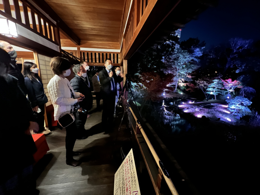その後、中心市街地に戻った一行は北九州のシンボル「小倉城」へ。最上階の天守では、本企画のために特別に夕食が用意。開催中の「小倉イルミネーション」や紫川の夜景を眺めながら、北九州の食材で彩られたお弁当に舌鼓する贅沢な時間を堪能した。その後はライトアップがリニューアルされた「小倉城庭園」へ移動。プロデューサーの丸々もとおは、「小倉城庭園の史実に基づいた“縁結び”をテーマに、人と人の縁が結ばれるような感覚を味わう光のショーで、国内初の演出です」と解説。参加者は静謐な庭園の中、池泉回遊式庭園の木々がライティングでカラフルなに灯る叙情的な演出に大きな感動を呼び込んだ。