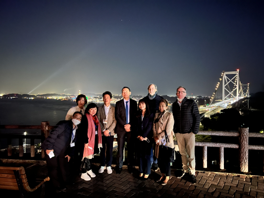関門海峡と関門橋を一望できる展望台で、夜景は本州と九州に跨る雄大な海峡夜景を鑑賞。参加者は関門橋のライトアップや情緒溢れる門司港レトロ、対岸のLED煌めく観覧車や海峡ゆめタワーなど、色彩豊かな大夜景に感動。最後には参加者での記念撮影も行われた。