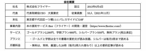 (株)フライヤーは、本の要約サービス「flier(フライヤー)」を運営する、ITベンチャー(2013年6月設立)です。最大の特長は「書評(レビュー)」ではなく「要約」である点です。書き手の主観が入る書評とは異なり、著者の主張や論理(重要ポイントや全体像)を忠実にまとめ、読者に伝えます。書評でないため、出版社と著者から要約の許可を得る必要があり、要約した原稿にも目を通していただくことで、高品質なサービスを提供しています。